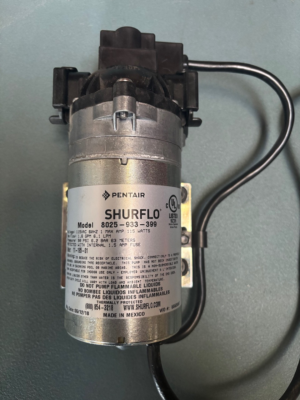 NEW 1.6 GPM 90 PSI Pentair Shurflo 8025-933-399 Water Pump 115V #3134-OB