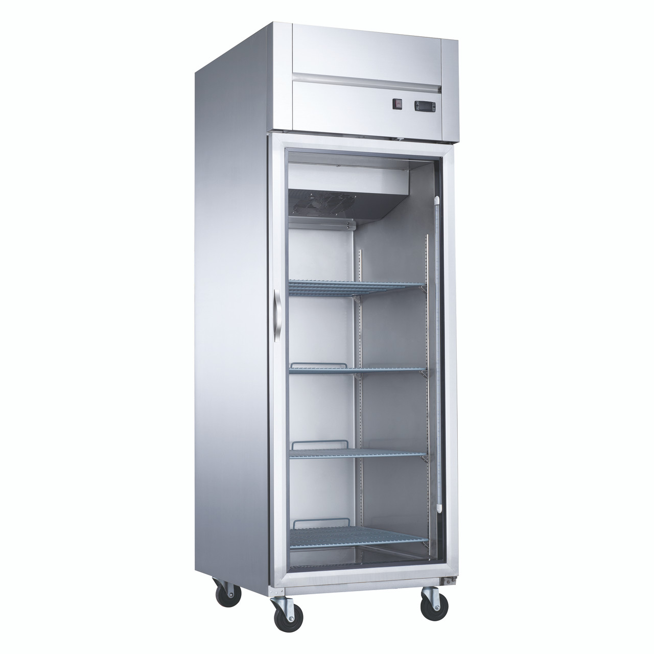 Dukers D28AR-GS1 has a glass door that easily swing open and close automatically. Using tempered glass, stainless steel is used for both the interior and exterior for better durability and dependability. Four casters allow you to position the unit anywhere and then lock it into place. Includes adjustable wire shelving. Top mounted compressor.