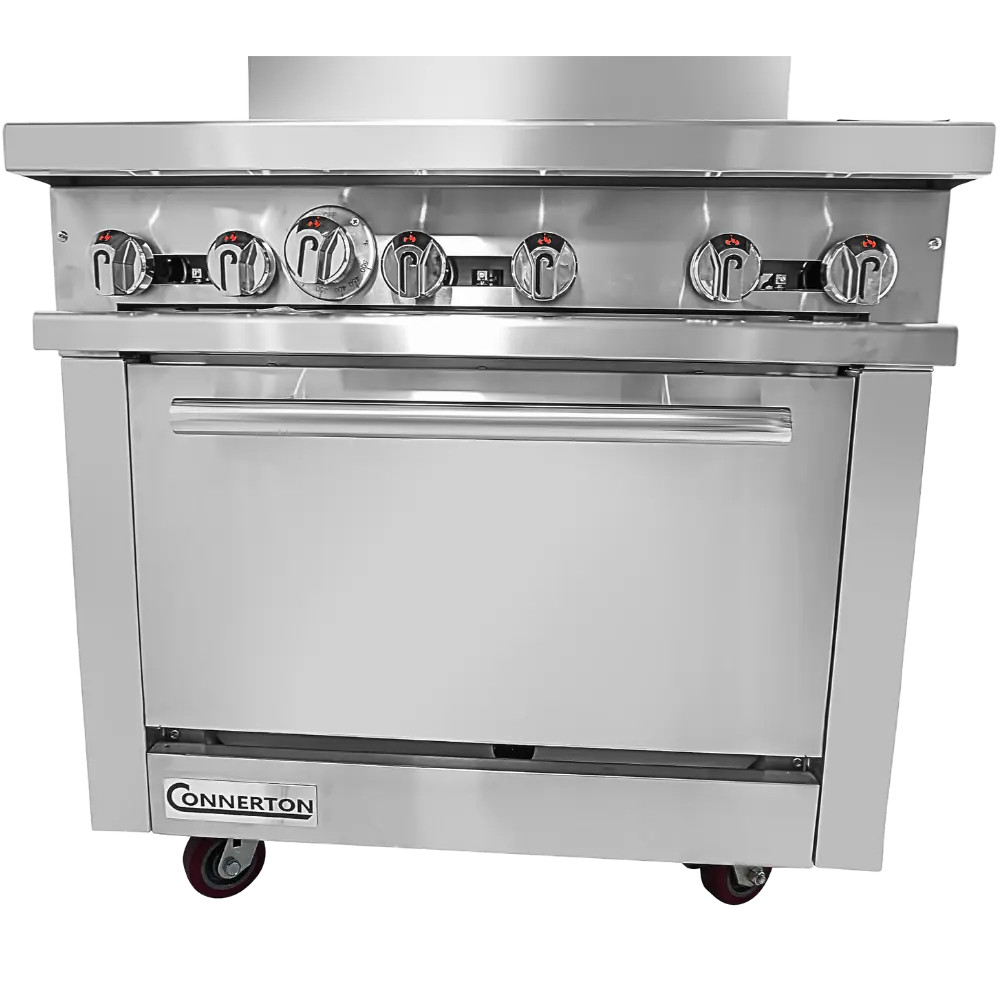 Connerton cooking systems restaurant range family of products feature stainless steel fronts, sides, and riser with removable high shelf. Performance profile is driven by 28,000 Btu open burners via energ savings flashtubes versus individual pilot lights. Heavy duty, cast iron burner grates include flame enhancing bowl configuration. CN model griddles are finely polished 1” thick steel. The CN ranges include full depth ‘bake and roast’ ovens of 35,000 Btu’s and incorporate a burner-baffle match for unique heat distribution supporting the operator’s need to either bake or roast.