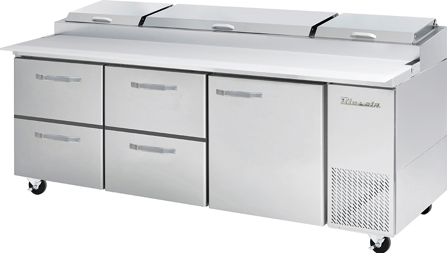 - NEW 4 Drawer (Left) 1 Door (Right) 93" Pizza Prep Table Refrigerated Stainless Steel Blue Air BAPP93-D4LM-HC #2479