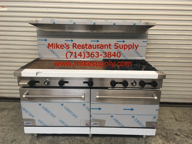 - NEW 60" LP Propane Range 6 Open Flame Burner 24" Griddle Flat Top W/ Full Ovens Stratus SR-6G24 On Wheels #7275