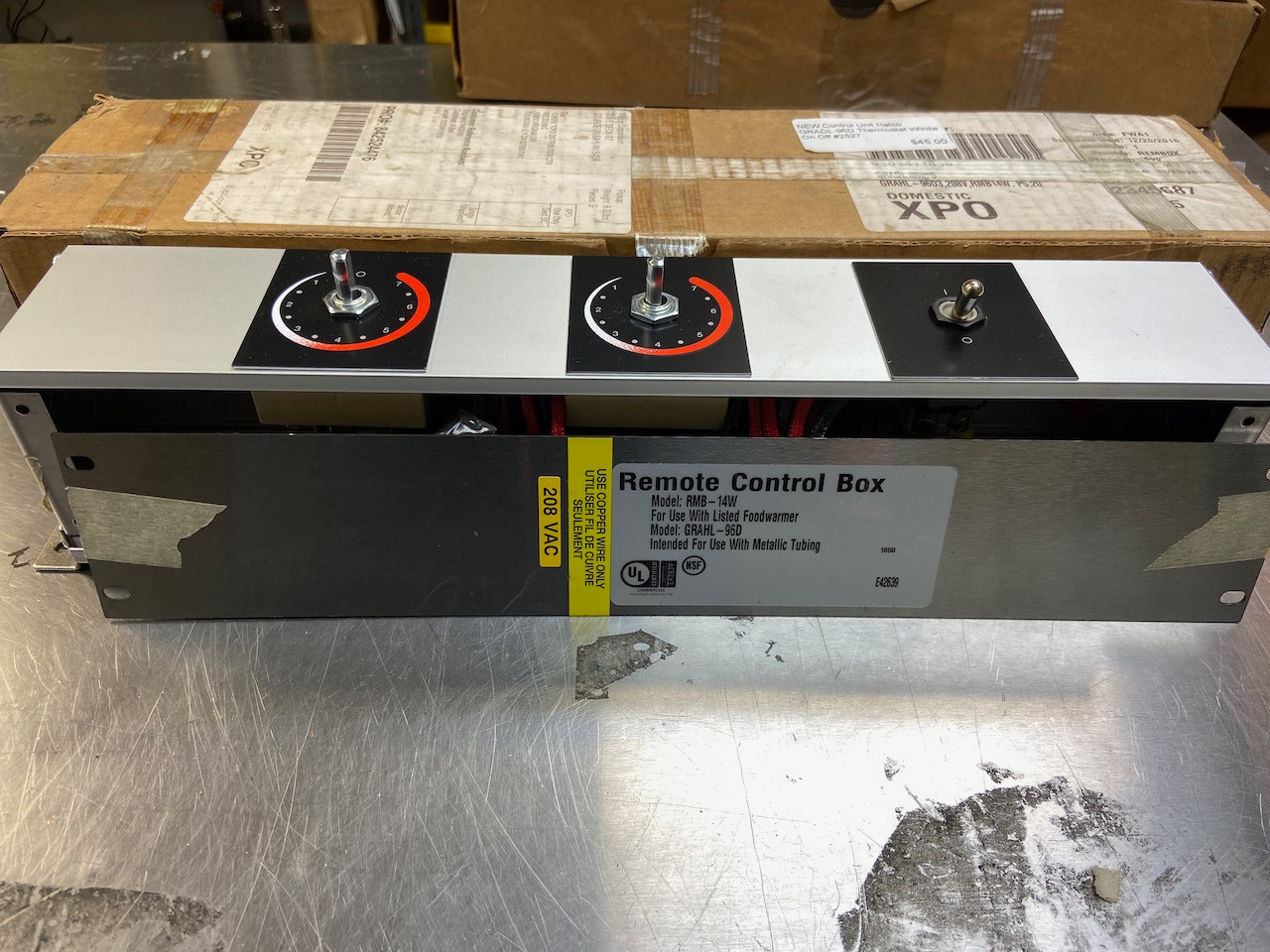 This Hatco RMB-14W remote control enclosure measures 14 inches wide by 3 inches deep by 2.5 inches high and is designed for use with a 208-volt Glo-Ray® strip heater. Its two infinite switches have a dial design that can be rotated for more exact control over the unit's settings. The toggle switch can be flipped on and off quickly.